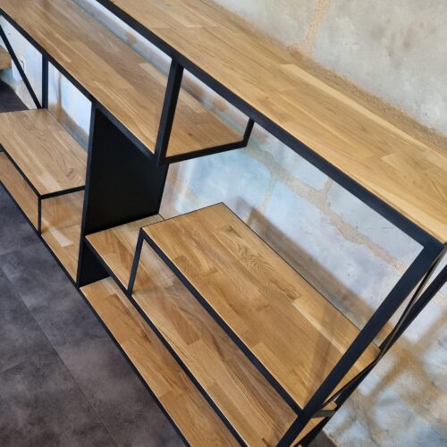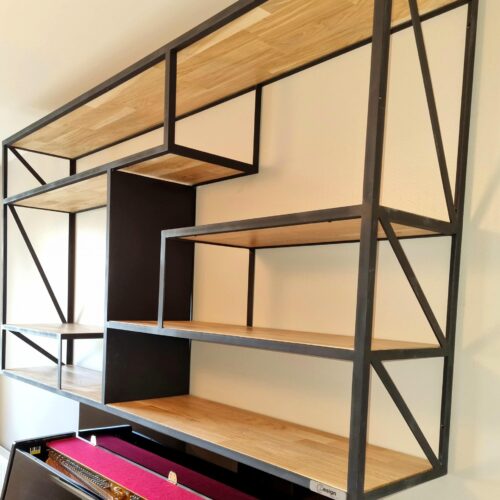 Cette bibliothèque a été pensée et réalisée de façon à proposer un meuble épuré,  minimaliste et surtout  imtemporel. Sa structure en métal noir s’allie parfaitement avec le bois de chêne.