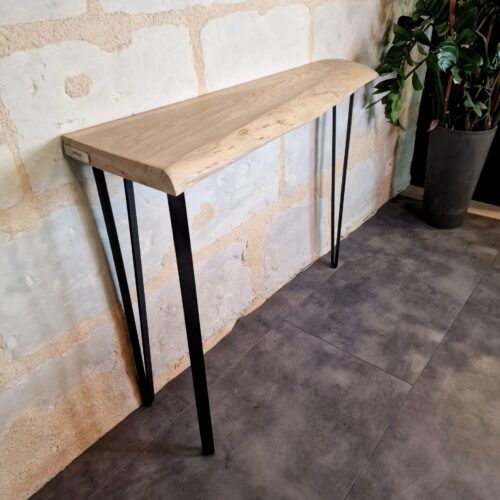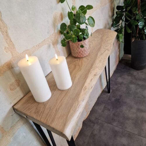 La console et Élégance affiche un piètement en métal anthracite et un dessus en bois de chêne massif.