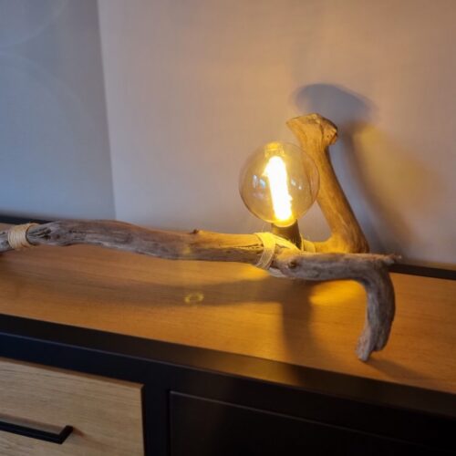 Ce luminaire bois flotté associé à la matière brute telles que le sisal est disponible en pièce unique.