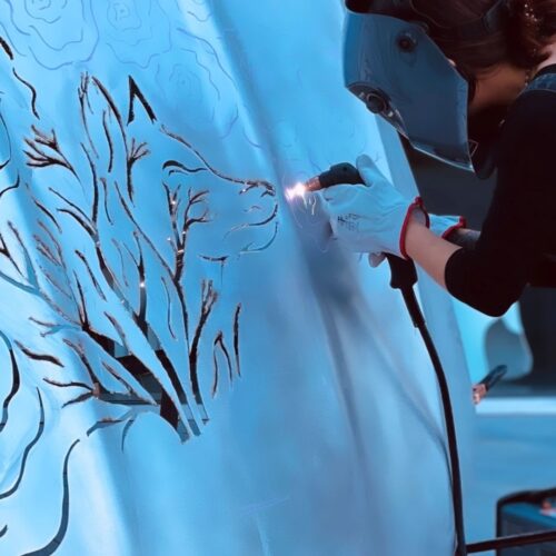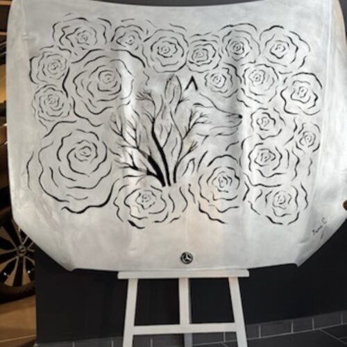 “Cette sculpture unique, réalisée sur un capot de Mercedes en aluminium, est le fruit du travail artisanal de l’artiste Cindy. Grâce à une découpe plasma manuelle, elle transforme le métal en une œuvre d’art sculpturale, mêlant précision et créativité.”